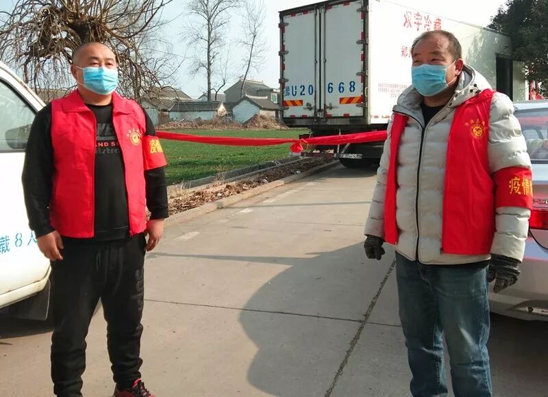 “不要串门、不要扎堆,呆在家里,勤洗手,常通风……”商小建、李宁在宣传防疫知识。他们还主动把自己的物流车、半挂车贡献出来,封堵路口。
